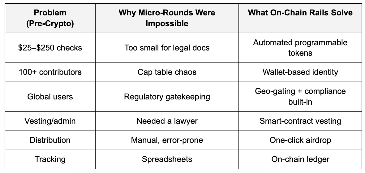 No cap table could handle 200 micro-checks.