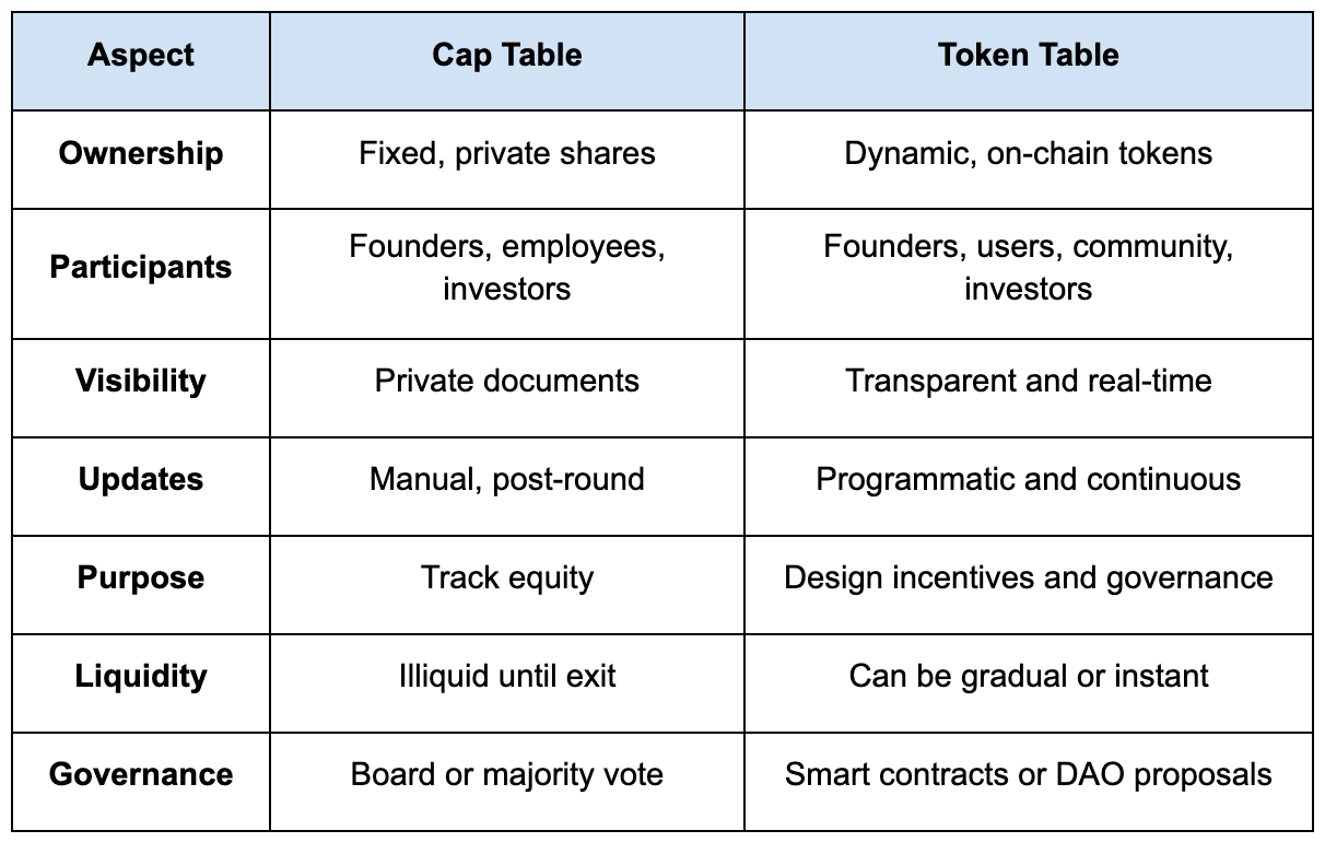 In other words, if a cap table tells you who built the company, a token table tells you who keeps it alive.